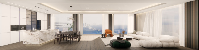▣ 집의 중심이 된 ‘쇼룸형 키친’과 독립과 공유가 어우러지는 집을 위한 ‘바스 인 룸’ 등 인테리어 상품 전략 푸르지오 에디션 2025에선 거주자가 한층 더 자신의 취향과 라이프스타일을 주거공간에 접목할 수 있도록 개발한 인테리어 아이템들을 소개한다. 우선 주방을 집의 새로운 중심에 배치하는 최신 트렌드를 반영한 ‘쇼룸형 키친’을 선보인다. 메인 작업 공간이 히든형으로 대면형 주방과 분리됐고, 독립형 아일랜드가 적용된 대면형 주방이 한층 더 탁트인 파노라마 LDK1)를 구현해 넓은 공간감을 만들어낸다. 이 쇼룸형 키친은 손님을 초대해 단란한 시간을 즐기길 좋아하는 고객, 혹은 거실에서 온전한 휴식을 취하고 싶은 고객들에게 제격이다.