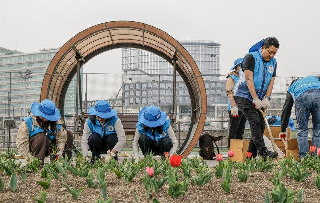 <사진설명: 대우건설 임직원들이 ‘대우건설 Nature’의 정원 정돈을 하고 있다.>